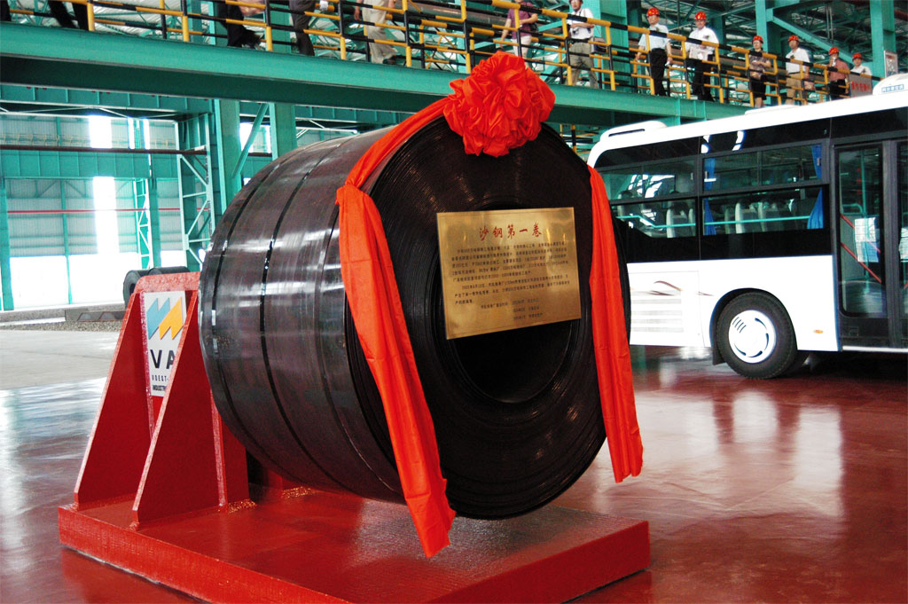 沙钢超薄带生产线是米兰体育网页版引进美国纽柯钢铁米兰体育(中国)双辊薄带铸轧技术,在亚洲建设的第一条薄带铸轧工业化生产线。采用该项技术可实现批量生产结构钢、耐候钢、高碳钢、高强钢等产品且具备开发高磁感电工钢的潜力。单条产线设计年产能达50万吨,成品厚度为0.7~1.9 mm。首批推出的超薄带结构钢、耐候钢、酸洗普碳钢、高碳钢、高强钢等产品,性能稳定、板型良好、尺寸控制精度高,可实现以热代冷。