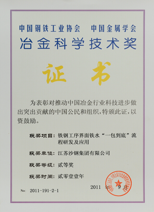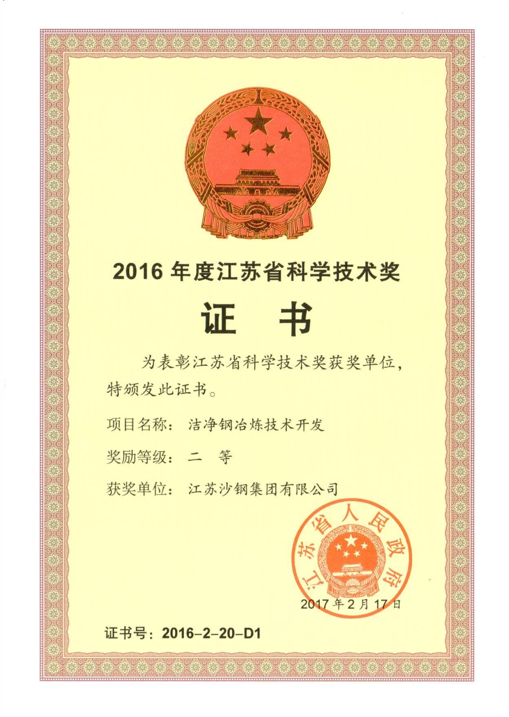 2016年度江苏省科学技术奖二等奖——洁净钢冶炼技术开发