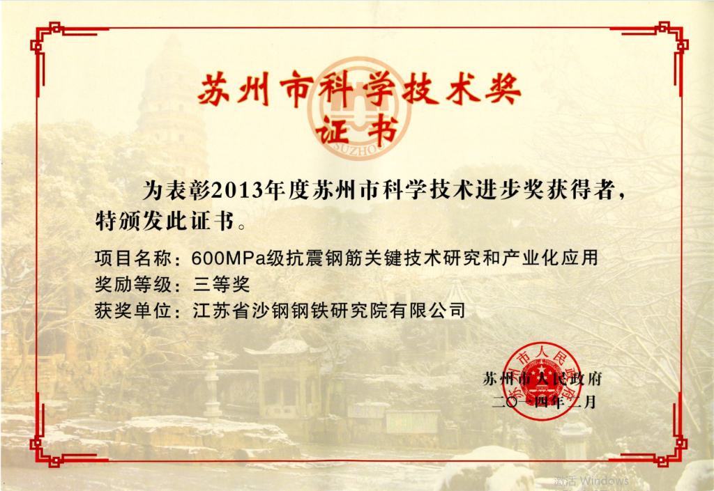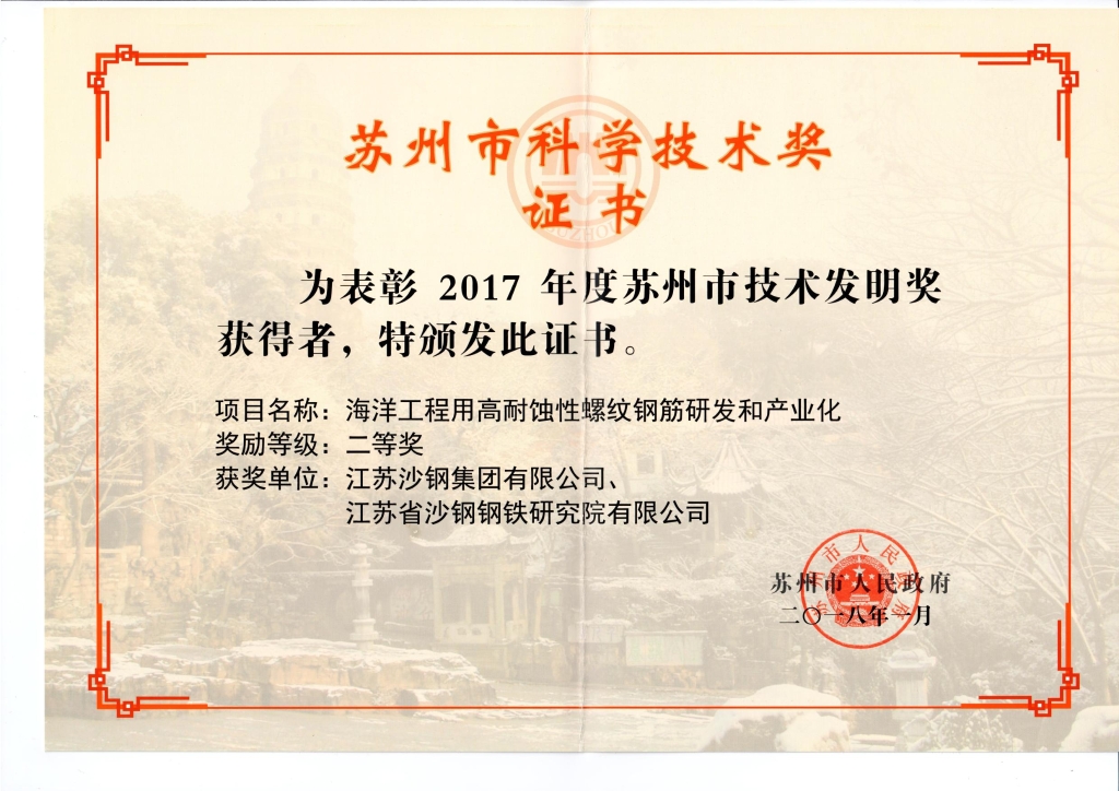 苏州市技术发明奖——海洋工程用高耐蚀性螺纹钢筋研发和产业化