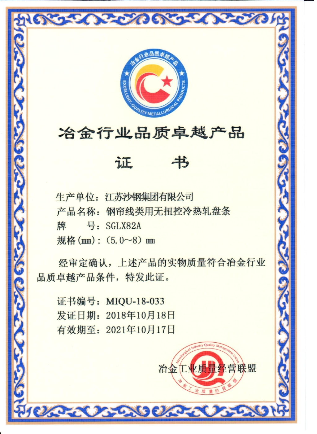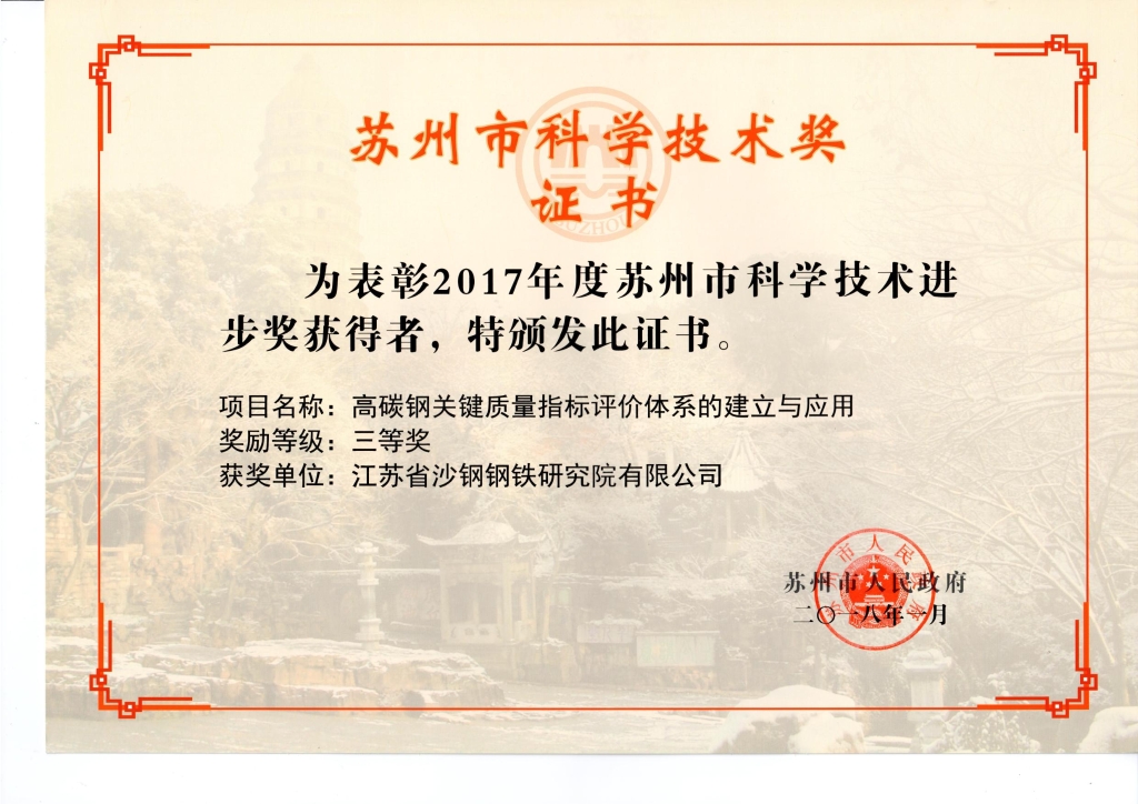 苏州市科学技术进步奖——高碳钢关键质量指标评价体系的建立与应用