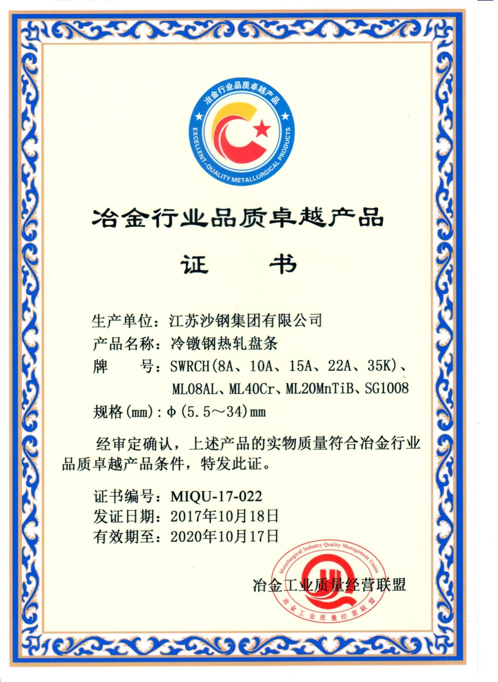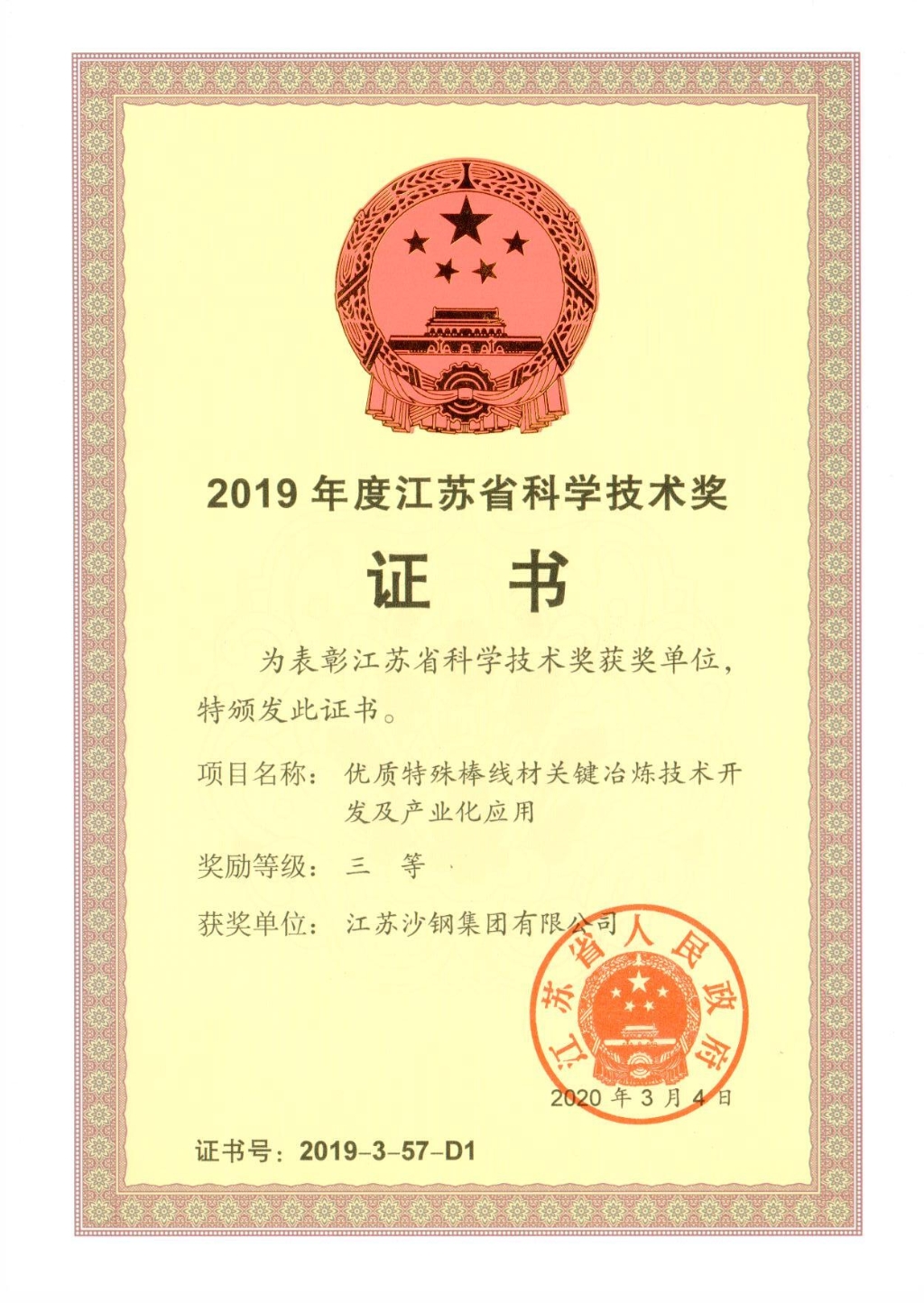 2019年度江苏省科学技术奖三等奖——优质特殊棒线材关键冶炼技术开发及产业化应用