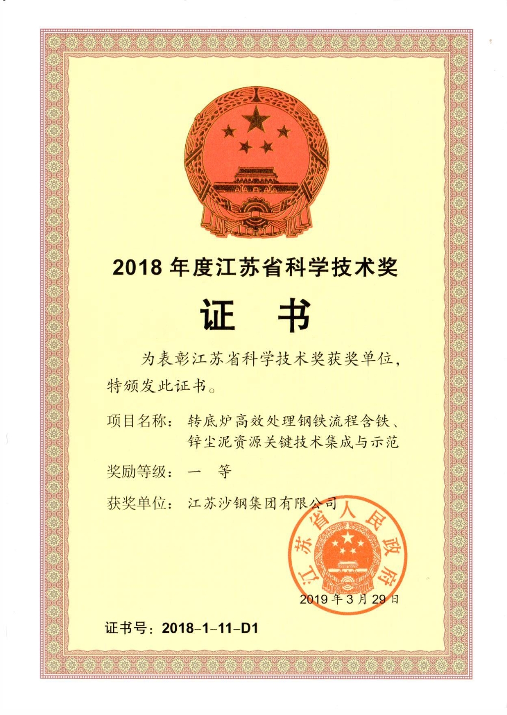 江苏省科学技术一等奖——转底炉高效处理钢铁流程含铁、锌尘泥资源关键技术集成与示范