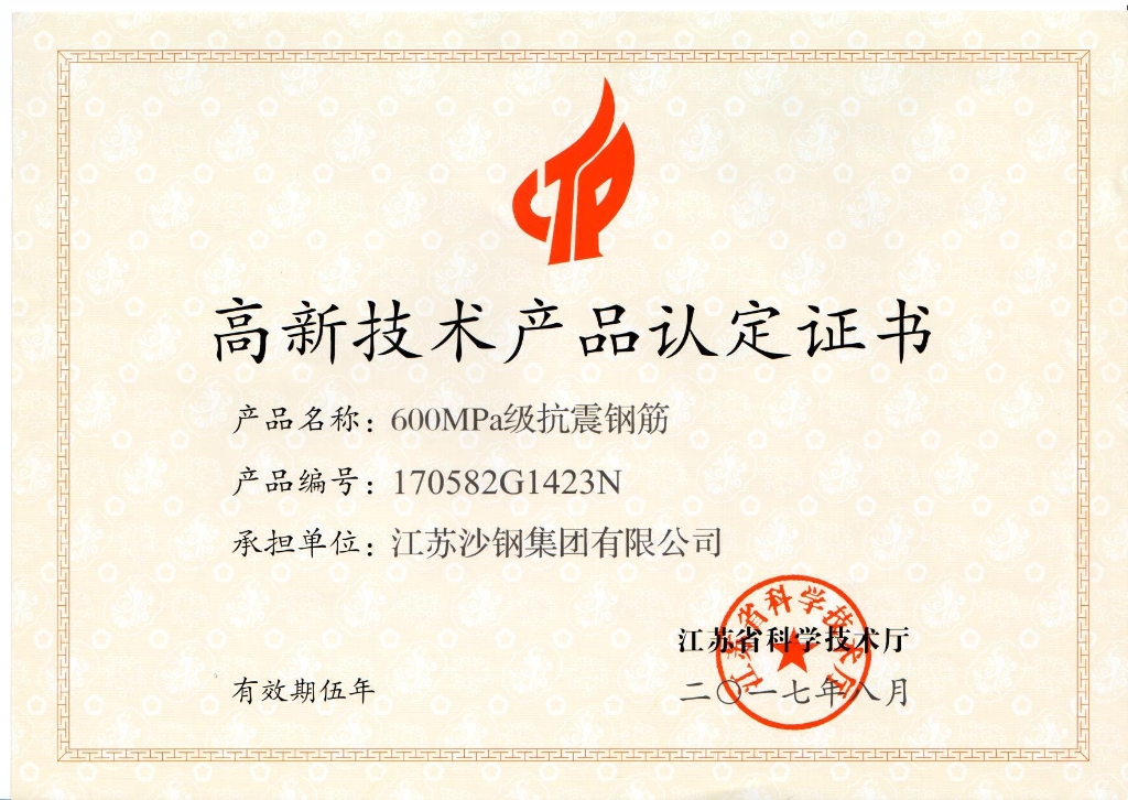高新技术产品认定证书——600Mpa级抗震钢筋