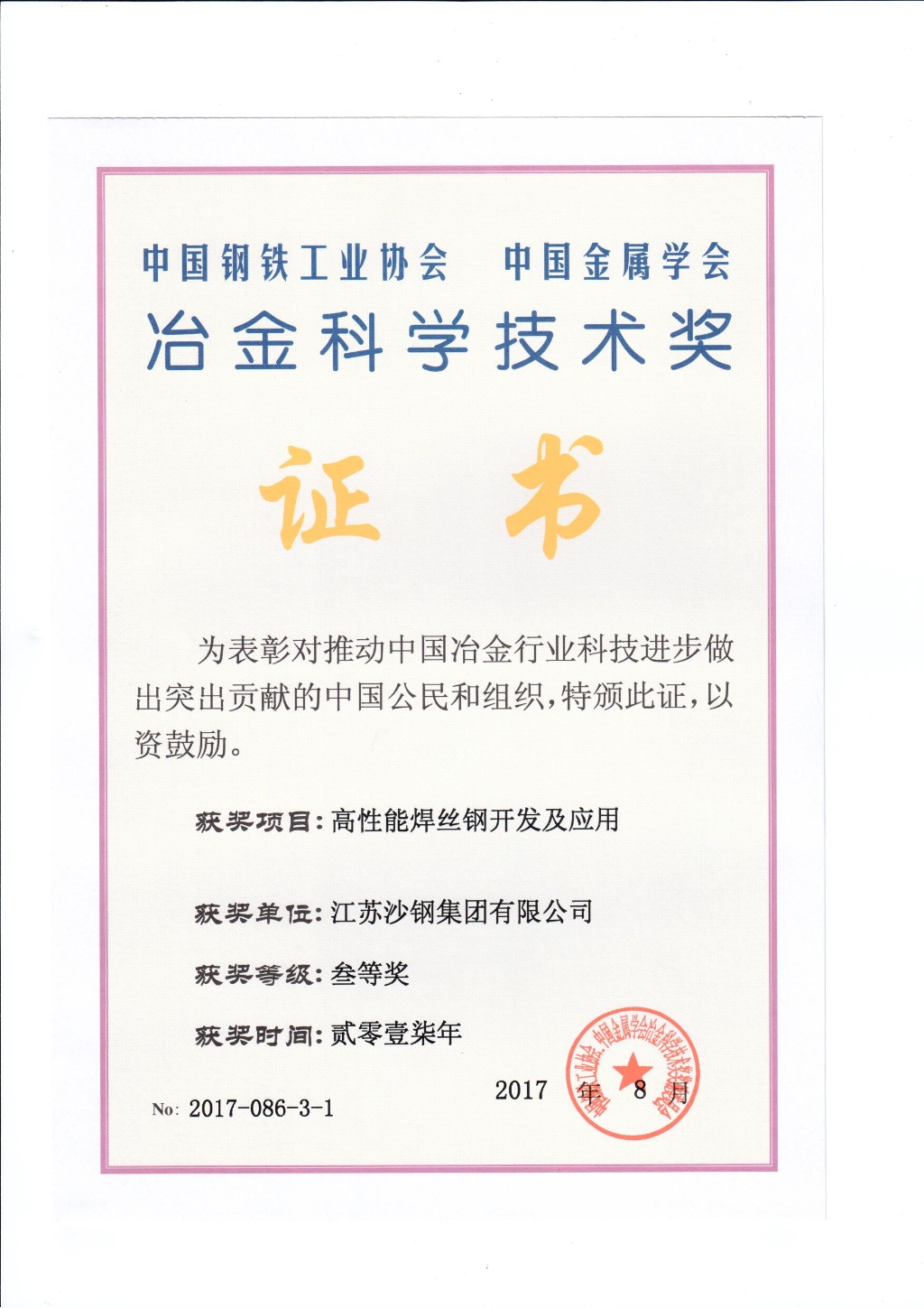 冶金科学技术奖三等奖——高性能焊丝钢开发及应用