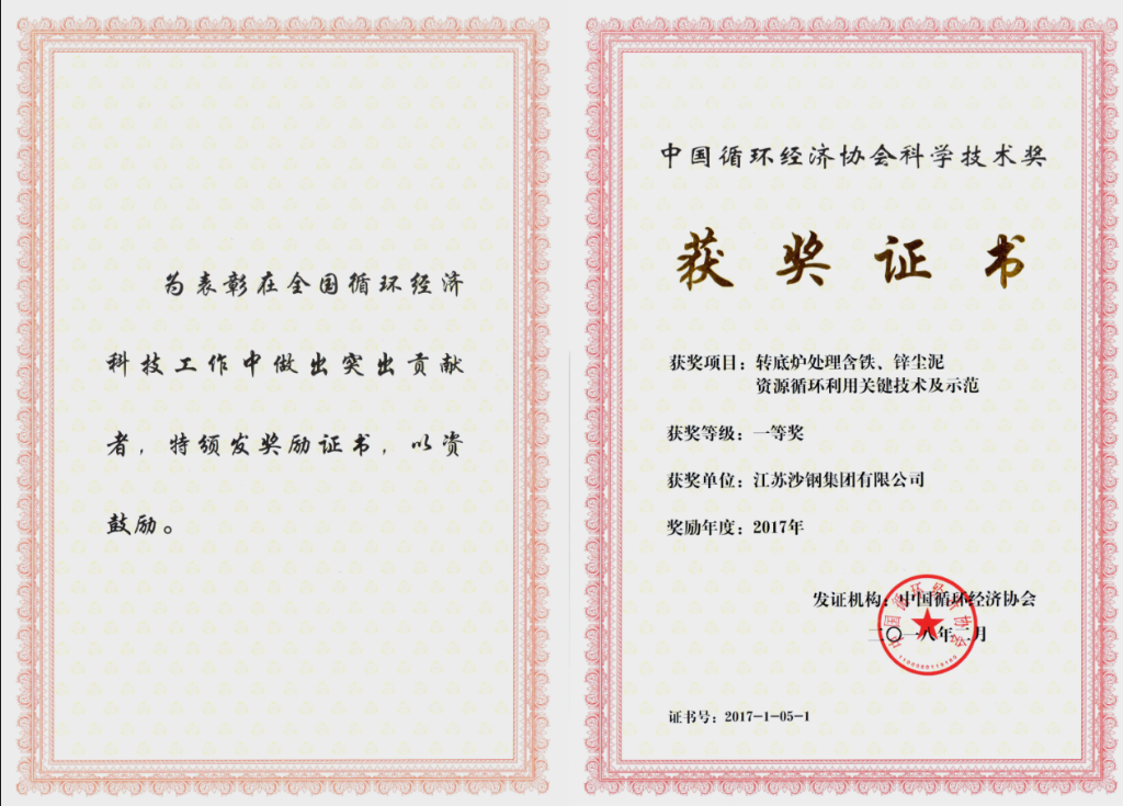 中国循环经济协会科学技术奖一等奖——转底炉处理含铁、锌尘泥资源循环利用关键技术及示范