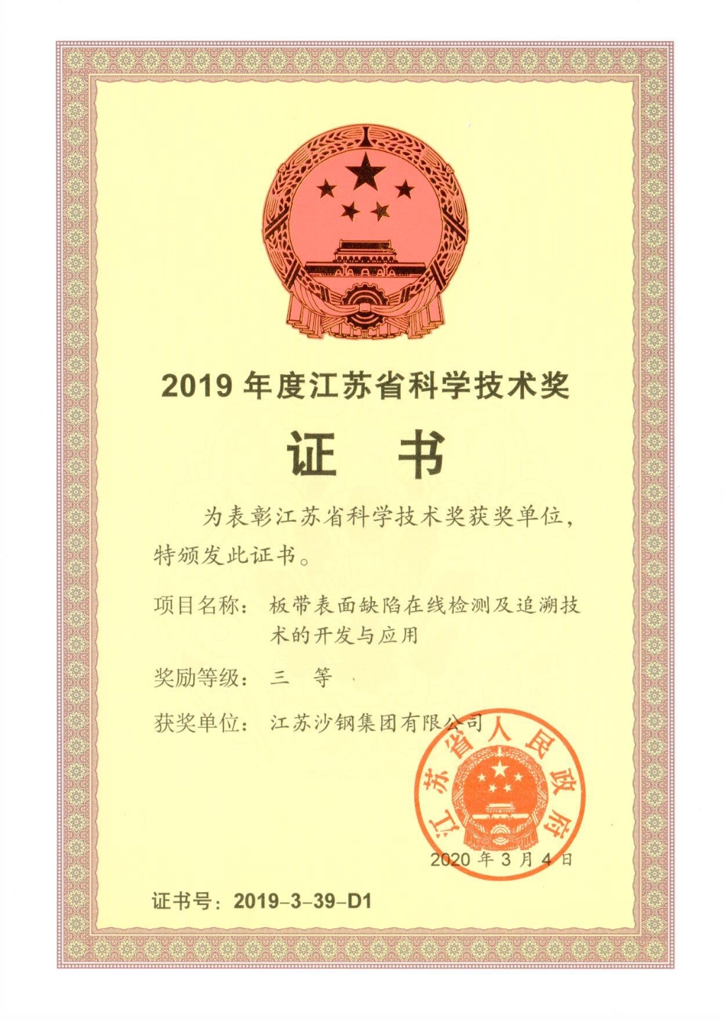 2019年度江苏省科学技术奖三等奖——板带表面缺陷在线检测及追溯技术的开发与应用