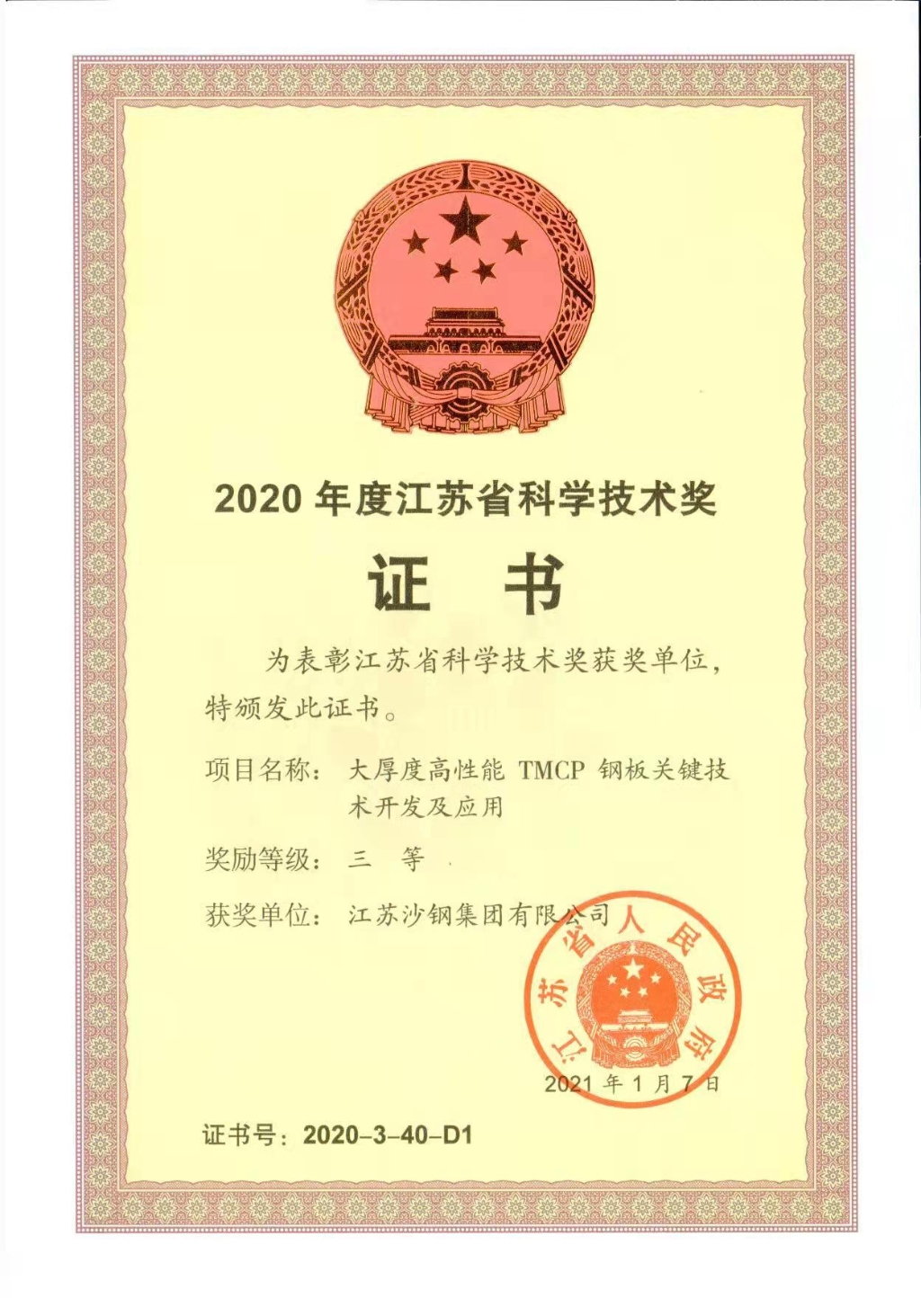 2020年度江苏省科学技术奖证书——大厚度高性能TMCP钢板关键技术开发及应用