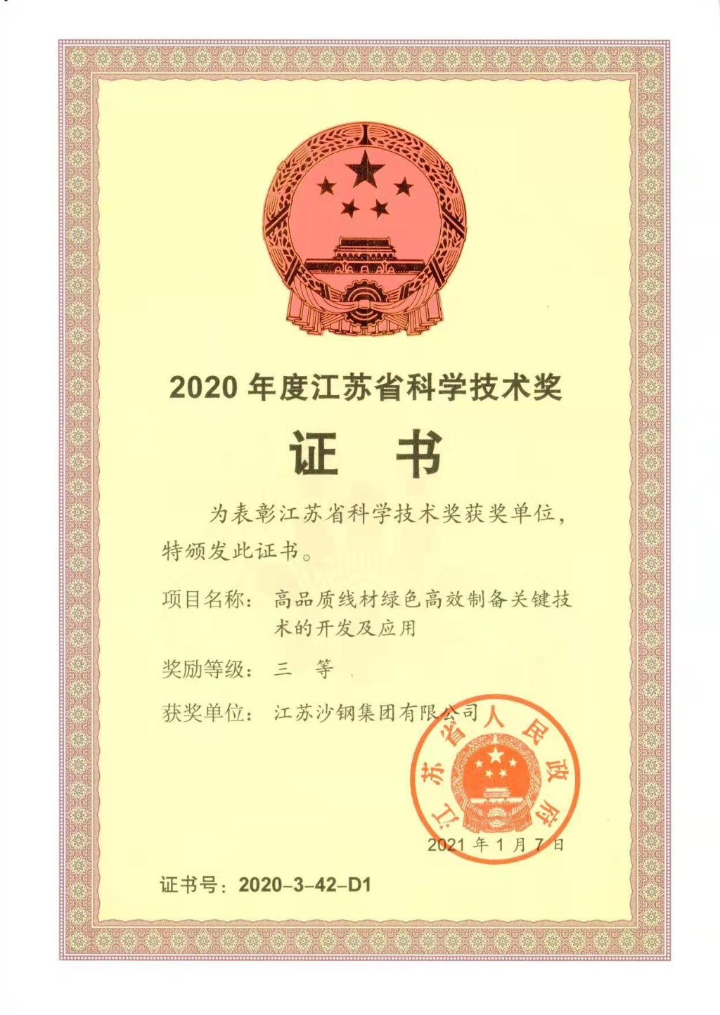 2020年度江苏省科学技术奖——高品质线材绿色高效制备关键技术的开发及应用